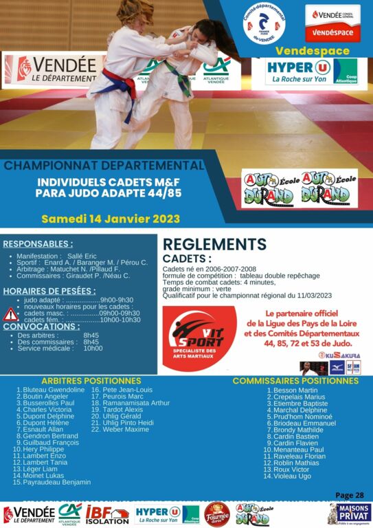 Championnat Individuels Cadets : NOUVEAUX HORAIRES
